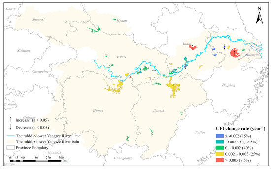 The interannual variation trends of the CFI and the associated change rates of CFI from 1990 to 2016 for all lakes and reservoirs were analyzed and are displayed in Figure 10 and Figure 11, respectively. With the changing rates of CFI (Figure 12) categorized as five levels (≤−0.002 year−1, −0.002 to 0 year−1, 0–0.0.002 year−1, 0.002–0.005 year−1, and >0.005 year−1), the number of selected lakes and reservoirs that fell into each level accounted for 15%, 12.5%, 40%, 25% and 7.5%. Similar to the results for CAP, 60% of lakes (18/30) and all reservoirs showed increasing trends in their CFIs, and the greatest increasing trend was found in Huanggai Lake (L26, with a change rate of 0.010 year−1), whereas the most pronounced decrease was observed in Shijiu Lake (L09, with a change rate of −0.016 year−1). Three of the lakes and two of the reservoirs showed statistically significant increasing trends in the CFI in 1990–2016. On the contrary, statistically significant decreasing trends in the CFI were observed in only two lakes, and these lakes were found in the middle and eastern MLYR basin.