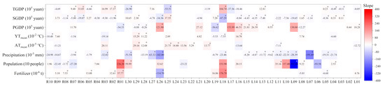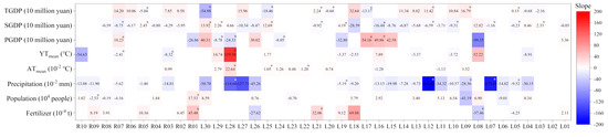 The regression coefficients (denoted as “Slope”) between the effective explanatory variables and the yearly cyanobacterial bloom area percentage (CAP) of the 30 lakes and 10 reservoirs examined. The “*” sign represents the statistically significant (i.e., z < 0.05) impact of the explanatory variable on CAP. The Slope (βi) indicates the degree of the direct influence of xi on y in the generalized linear model (GLM) equation “y = β0 + β1x1+β2x2+…+βixi+μi”. The value of each Slope is shown to avoid that the fill color is too shallow to see clearly. To normalize the magnitude of the Slope, each driving factor was multiplied by a factor. The labels of the abscissa axis from right to left are consistent with the positions of the lakes and reservoirs from east to the west in the middle–lower Yangtze River basin, and the codes (e.g., L01) correspond to those in Table 1, which are arranged by their longitudes.