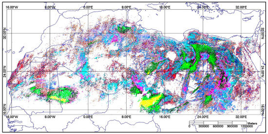 17] wanted to identify “optimal” regions that were common across all image bands. They used an unsupervised classification technique to generate a set of 19 classes or “clusters” of spectrally similar OLI image pixels of North Africa based on cloud-free image data filtered for 5% or less temporal uniformity. Each of these clusters can be considered as an “extended” Pseudo Invariant Calibration Site (EPICS). One of the resulting clusters, Cluster 13, was found to possess a spectral response similar to Libya-4, and it contained a significant number of pixels forming relatively large contiguous regions across North Africa; this demonstrated great potential to ensure higher frequency imaging. However, their analysis required downsampling the image data to 300 m spatial resolution, and their results could not be validated with respect to the full resolution image data. In addition, potential BRDF effects were not addressed when generating the spatial and temporal statistics from original cluster data.