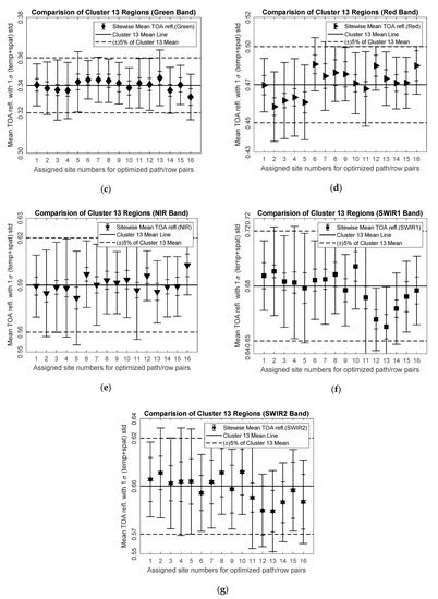 The analysis in this work is more focused on Cluster 13 as it has better spatial uncertainty across all the bands and widely distributed across North Africa. But there are other clusters, such as Cluster 1, 3, 4, 16, and 19, which have spatial uncertainty and distribution across North Africa comparable with Cluster 13. Initial results showed that these clusters also offer nearly daily acquisition as Cluster 13. These clusters possess a similar potential to be used for EPICS based sensor calibration within their specified uncertainty. The darkest of the found clusters, Cluster 4 has temporal TOA reflectance mean values ranging from 0.177–0.380 with absolute standard deviation values ranging from 0.011~0.0016. This generates temporal uncertainty values ranging from 5%~8% which are the highest values among the considered clusters and can be useful for calibration purposes considering the intensity level of this cluster. Furthermore, these clusters have different intensity levels which can help to perform radiometric calibration and stability monitoring of any satellite sensors in a wider dynamic range.