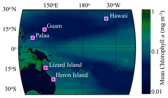 Median derived dissolved and non-algal absorption (adg) at 440 nm was comparable across Heron, Lizard, Palau, and Guam campaigns with a value of 0.045 m−1, but values were higher and more variable for both campaigns in Hawaii, with median values approximately double compared to other sites (>0.1 m−1). Differences were less pronounced for absorption by phytoplankton (aph) with a median of 0.030 m−1. Hawaii campaigns also showed higher variability in aph across stations. Particulate backscattering (bbp) at 532 nm, an indicator of phytoplankton and sediment resuspension [84] was also quite variable across sites with a median value of 0.008 m−1. Heron Island had the lowest magnitude and variability in bbp, while both Hawaii campaigns had the highest amount and variability. The impact of the reef benthic community on water column bbp is particularly evident on the Kaneohe Bay, Hawaii barrier reef, which is known to produce and resuspend fine carbonate sediments [26,85,86,87].