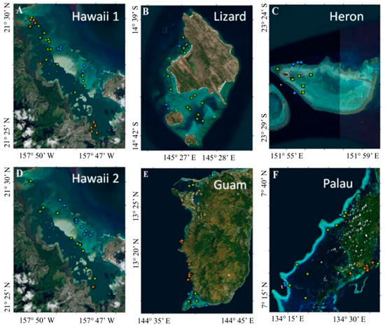 Broadly, stations included fore, back, fringing, and patch reef zones, as well as lagoons, river mouths, and nearshore coastal areas (Figures S1–S6). Benthic environments included varying mixtures of live and dead coral, coralline rubble and pavement, multiple types of benthic micro- and macro-algae, seagrasses, and carbonate and basaltic sediments.
