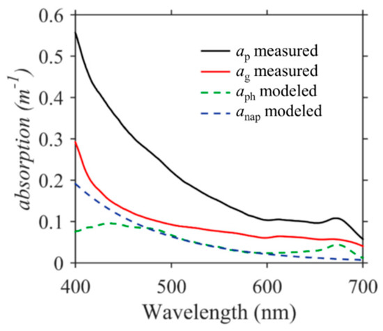 Example station showing the measured spectral particulate and dissolved absorption coefficients (ap and ag) and the modeled results from partitioning ap into absorption by phytoplankton (aph) and non-algal particles (anap).