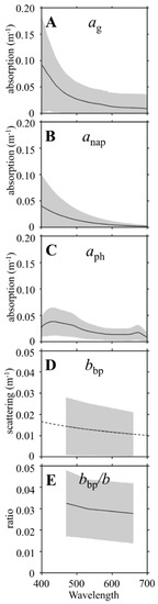 Mean spectra measured across all sites for (A) absorption by colored dissolved organic matter (ag), (B) non-algal particles (anap), and (C) phytoplankton (aph), (D) particulate backscattering (bbp) and (E) backscattering ratio (bbp/b). Shaded areas are ±1 standard deviation. The dashed line (D) represents the slope of backscattering Y.