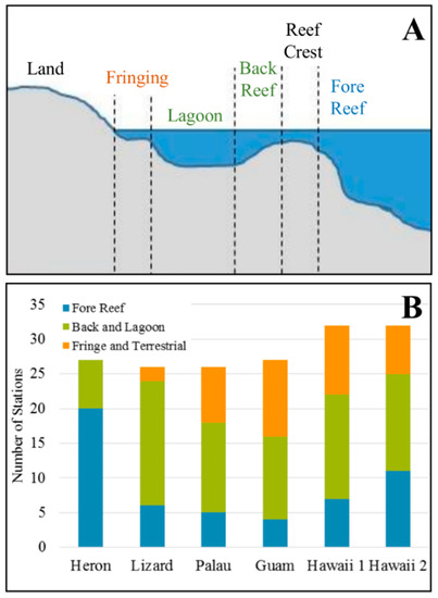(A) A visual depiction of the different tropical coral reef zones going from the outer fore reef most influenced by oceanic water to the nearshore fringing and terrestrially impacted zone. (B) The number of stations sampled from each campaign with the three broad geomorphic zones color coded similarly to panel (A).