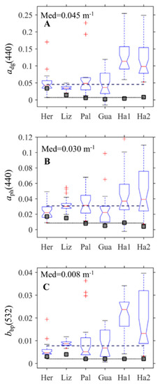 Boxplots of the optical properties measured at Heron Island (Her), Lizard Island (Liz), Palau (Pal), Guam (Gu), and Hawaii summer (Ha1) and Hawaii winter (Ha2) in comparison to MODIS imagery collected offshore for the same time period (gray squares) for (A) absorption by colored dissolved organic matter and non-algal particles at 440 nm (adg); (B) absorption by phytoplankton at 440 nm (aph); and (C) particulate backscattering at 532 nm (bbp). The median values are shown as lines and in text for all campaigns (Reef) and MODIS values (Offshore). Extreme outliers were removed for clarity.