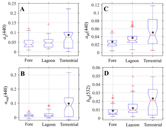 Boxplots showing the variability of the water column optical properties aggregated by three broad geomorphic zones: fore reef (Fore), back reef and lagoon (Lagoon), and fringing and terrestrially-impacted reef (Terrestrial). Properties include: (A) absorption by colored dissolved organic matter at 440 nm (ag); (B) absorption by non-algal particles at 440 nm (adg); (C) absorption by phytoplankton at 440 nm (aph); and (D) particulate backscattering at 532 nm (bbp). Starred values indicate that the values were significantly different (p < 0.05) in paired tests with the other two zones.