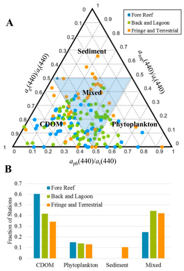This is particularly evident in the more oceanic waters of the fore reef stations where 60% of the stations were influenced by CDOM. The back/lagoon and fringing/terrestrial zones were more of an equal mixture between CDOM-dominated and waters influenced by equal parts of CDOM and phytoplankton (Figure 8B). The fringing/terrestrial zone was the only one where sediment occasionally was the dominant absorber consistent with the presence of fluvial influences. Benthic sediments on coral reef banks tend to be white colored with high scattering and low absorption properties [47,88].