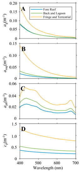The variability in the measured and derived optical properties is presented and discussed below in terms of the different regions sampled at a single point in time in comparison to offshore locations during a similar time frame, and across geomorphic zones. Each sampling location was assigned to one of six geomorphic zones (Table 3) based on prevailing reef classifications [80,81,82].