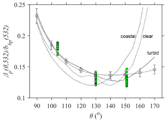 Angular particulate scattering measured at three angles in the backward direction (θ = 104°, 130°, and 151°) normalized to the backscattering coefficient at 532 nm (β(θ,532)/bbp(532)) compared to published measurements and models of the phase function in the backward direction (90°–180°). The solid line with error bars depicts measurements from Sullivan and Twardowski [91] across diverse water types and the coastal, clear and turbid phase function are from Petzold [92]. Figure adapted from [91].