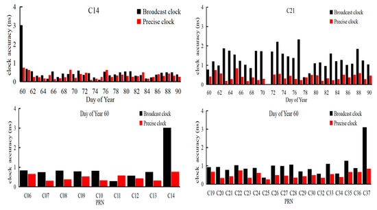 Figure 5 shows the daily accuracy (i.e., the RMS of all the epochs of a day) of the predicted clock offset obtained from the three schemes on DOY 60 for each of the BDS-2/BDS-3 satellites.