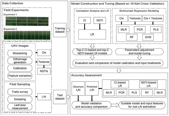 Therefore, the objectives of this study were to compare predictive performance of UAV-based color indices and texture features for rice LAI estimation and to explore the potential of improving rice LAI estimation by incorporating both color indices and texture features into appropriate multivariate regression modeling methods.