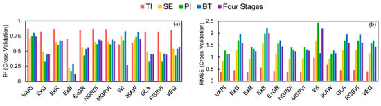 Cross-validated R2 (a) and RMSE (b) of the CI-based simple linear regression models for rice LAI estimation at and across the growth stages of tillering (TI), stem elongation (SE), panicle initiation (PI), and booting (BT), respectively.