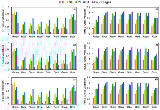Cross-validated R2 (a,c,e) and RMSE (b,d,f) of the single texture-based simple linear regression models for rice LAI estimation at and across the growth stages of tillering (TI), stem elongation (SE), panicle initiation (PI), and booting (BT), respectively.
