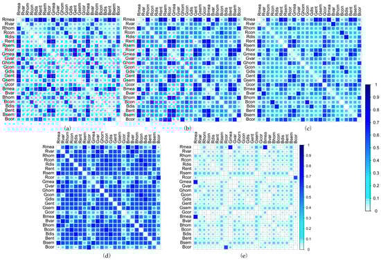 Utilization of NDTI is one of the promising solutions of combining two different textures for LAI estimation. Figure 6 shows the cross-validated R2 of LR models based on the NDTI with randomly selected T1 and T2 at and across different growth stages. The R2 values of these models varied notably among four growth stages. Unlike the CI-based ones, most NDTI-based LR models performed better during the booting stage (Figure 6d) as compared to other three stages. However, most NDTIs showed poor associations with rice LAI across all four growth stages except for NDTI (Rmea, Bmea), NDTI (Rmea, Gmea) and NDTI (Rcor, Bcor) (Figure 6e), indicating the importance of texture selection when using NDTI-based models for different stages.