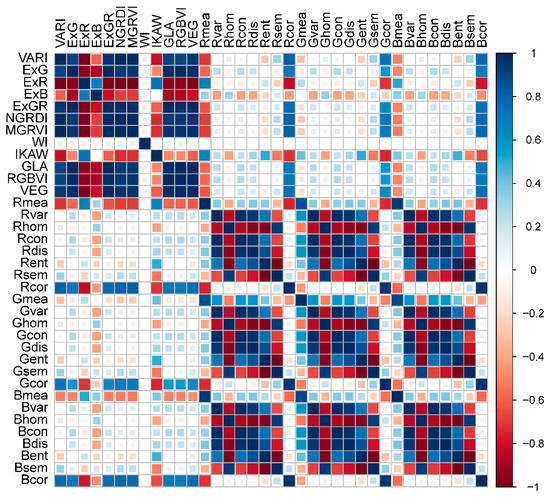 Pearson’s correlation coefficient (r) between UAV RGB image-derived color indices and textures.