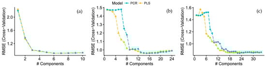 Cross-validated RMSE values over the number of components for PCR and PLS using inputs of CIs (a), textures (b), and combined CIs and textures (c), respectively.