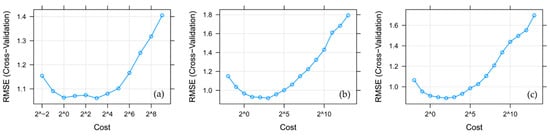 Cross-validated RMSE values over the parameter Cost using inputs of CIs (a, σ = 0.4511), textures (b, σ = 0.2146), and combined CIs and textures (c, σ = 0.7941), respectively.