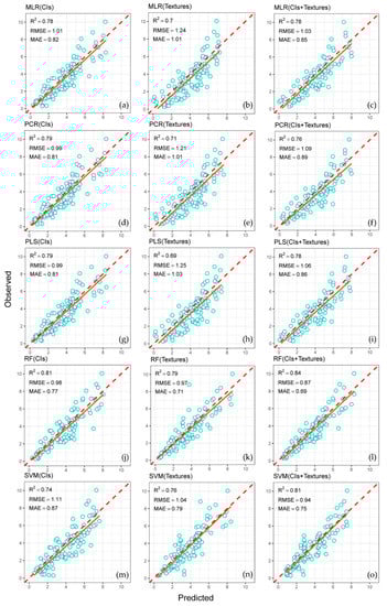 The scatter diagrams in Figure 11 reveal the accuracy assessment results of the multivariate regression models for cross-stage LAI estimation based on the independent test dataset. Overall, the predicted LAIs by all five multivariate methods showed moderately high accuracies when compared to the observed LAIs, with RMSE varying from 0.87 to 1.25 and MAE ranging from 0.69 to 1.03. As shown in Figure 11a–i, for the three linear regression methods (MLR, PCR, and PLS), the texture or CIs + Textures based models did not show better results than the ones only using CIs as inputs. Conversely, the RF and SVM models based on Cis + Textures performed better than the ones using CIs or textures only (Figure 11j–o).