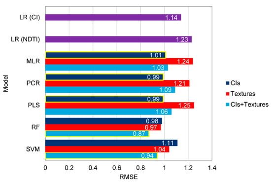 Comparison of the predictive accuracies of the best CI-based LR, best NDTI-based LR, and multivariate regression models (MLR, PCR, PLS, RF, and SVM) in test datasets with inputs of CIs, Textures and combined CIs + Textures, respectively. The optimal input treatment (minimum RMSE) of each multivariate regression model is highlighted by yellow frame.