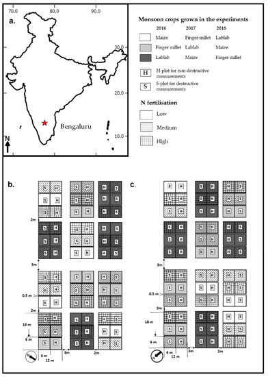 The study was conducted during 2016–2018 at GKVK campus of University of Agricultural Sciences, Bengaluru (UASB) located in the eastern dry zone of Karnataka state, India (12°58′20.79′′N, 77°34′50.31′′E, 920 m.a.s.l) (Figure 1a). The soils of the study area are formed by Kandic Paleustalfs and Dystric Nitisols as dominant soil types and the climate is described as tropical savanna climate with the rainy season from June to October. The mean annual temperature is 29.2 °C with an average precipitation of 923 mm [24]. The total rainfall and mean temperature data of the monsoon cropping season varied from 2016 to 2018 (Table 1) [25].