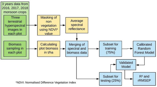 To predict the fresh matter biomass (FMB) from reflectance data, machine learning random forest regression (RFR) in caret package [35] was used [36]. Although RFR does not require normal distribution of the FMB dataset, the original dataset was skewed towards one side. Hence, the FMB measured in the S subplots were cube root transformed to assure normal distribution of the dataset. RFR is a regression tree technique, which builds multiple decision trees and ensembles them for an accurate prediction [36]. It is less sensitive to overfitting as the subsets are drawn randomly each time. The regression trees has the ability to deal with complex relationships between variables for large datasets [37]. Each crop was modelled separately for R and I experiment based on three years datasets (6 models). Further, the datasets from both irrigation regimes on each crop were combined to give one Generalised model to check the robustness of the model independent of water supply. To eliminate the bias involved in splitting the data into training and testing sets, 100 different random subsets (75% for training and 25% for testing) were generated based on the sampling dates for each crop separately. Using these random subsets, 100 RFR models were calibrated and validated to predict the FMB for each crop from reflectance data. All machine learning methods have specific configuration parameters called tune parameters or hyperparameters, which optimise the performance of the predictive modelling algorithm [38]. For RFR model, two tune parameters need to be determined, i.e. number of trees and mtry. The number of trees parameter was always kept to a default value of 500 and the mtry parameter value was tuned using the repeated cross-validation (five-fold, three repeats) procedure. The mtry parameter value was set between 1 and 15 and the optimum mtry parameter for each model was identified. The model estimation accuracy of FMB was evaluated using R² validation (R²val) (Equation (1)) [39], the root mean square error of prediction (RMSEP) (Equation (2)), and the relative root mean square error prediction (rRMSEP) (Equation (3)).