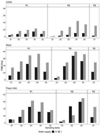 In the rainfed experiment, the range of FMB (S sub-plot) over the three years 2016–2018 was 0.16–14.6 t/ha for lablab, 0.76–67.71 t/ha for maize and 0.89–59.39 t/ha for finger millet (Figure 3). Similarly, for irrigated experiment, it was 0.22–44.33 t/ha for lablab, 2.28–79.38 t/ha for maize and 0.91–69.63 t/ha for finger millet. Crop growth continuously increased until S3 or S4 and started to decrease at later stages in all crops and along the three years. The FMB was higher in I than R experiment except for finger millet at Y1S1 and Y2S2.