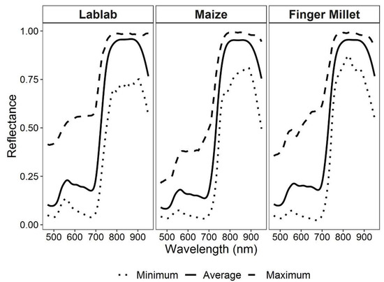 To gain an impression of the spectral variation for each crop, minimum, average and maximum spectral reflectance from the images of rainfed and irrigated experiments were determined for the three crops lablab, maize and finger millet during the three monsoon seasons (Figure 4).