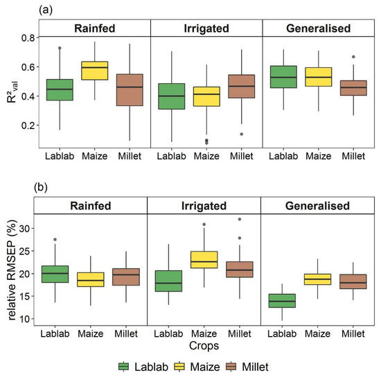 Prediction accuracy measured as R²val (a) and rRMSEP (b) values of the models (Rainfed, Irrigated and Generalised) for fresh matter biomass of lablab, maize and finger millet. Models were built on data from three different years, three levels of N and two levels of water supply (i.e., rainfed and irrigated).
