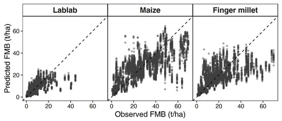 Plot of fit of the Generalised models for fresh matter biomass (FMB) of lablab, maize and finger millet. Each plot shows predictions from 100 RFR models with randomly selected calibration and validation data. Models were built on data from three different years, three levels of N and two levels of water supply (i.e., rainfed and irrigated).