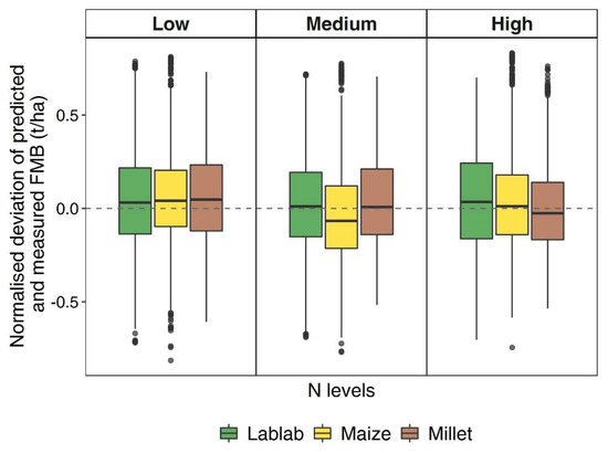 Normalised deviation between predicted and measured biomass for lablab, maize, and finger millet at three levels of N application (low, medium and high). Predictions were based on the Generalised model. Values were averaged over 11 sampling dates (2016–2018) and two levels of water supply (i.e., rainfed and irrigated).