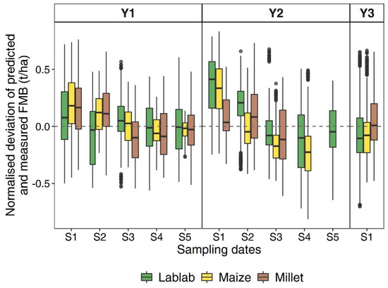 Normalised deviation between predicted and measured fresh matter biomass (FMB) for lablab, maize and finger millet at each sampling date (S1–S5) over three years (Y1–Y3). Predictions were based on the Generalised model. Values were averaged over 11 sampling dates (2016–2018) and two levels of water supply (i.e., rainfed and irrigated).