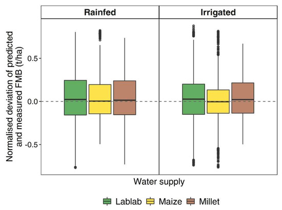 Normalised deviation between predicted and measured biomass for lablab, maize and finger millet at two levels of water supply (rainfed and irrigated). Predictions were based on the Generalised model. Values were averaged over 11 sampling dates (2016–2018) and two levels of water supply (i.e., rainfed and irrigated).