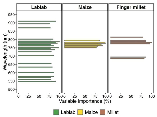 The wavelengths of the crop helped in differentiating and identifying the crop traits based on their spectral region. The best model was identified out of 100 Generalised models on each crop based on the lowest RMSE value. From the best model, the wavelengths contributing above 75% in the prediction of FMB were identified, as shown in Figure 10. For lablab, it was found that a multitude of spectral bands from the green, red and near infrared (NIR) region (546–910 nm) contributed significantly to the estimation of biomass. Contrastingly, for maize, only wavelengths in the NIR region (750–794 nm) and for finger millet in both the red and NIR region (686, 694, and 774–814 nm) were important.