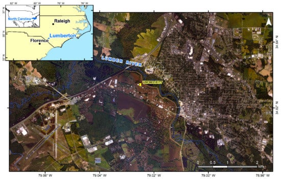 On 8 October 2016, Hurricane Matthew made landfall on the southeast coast of South Carolina and slowly moved northwards into North Carolina. Even though it had significantly weakened from a Category 5 to Category 1 hurricane at the time of landing, and was an extratropical cyclone by the time it arrived at North Carolina [19], torrential rains still brought >200 mm cumulative precipitation depths on 9 October (according to the National Oceanic and Atmospheric Administration (NOAA)’s ground weather station USC00315177; see Figure 1 for location) and caused record-breaking flood levels along the Lumber River. A levee broke, resulting in four flood-related deaths and more than 1500 people evacuated. Most of the region was still in knee-deep water two days after the hurricane passed [19].