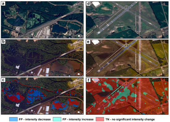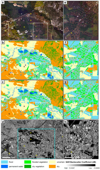 Another source of overprediction comes from the during-event intensity increase in the Dry class (Figure 11). One example is shown in patch 4, in which the soil underneath the sparse low meadow appeared darker in the during-event aerial image (Figure 12e) than the pre-event satellite image (Figure 12d); However, there was no water visible on the surface. This is a known effect of soil moisture, where the rise in soil moisture will also give rise to a radar backscattering intensity increase [36,37]. This effect is more obvious in bare soil or sparse meadow land cover types and, hence, affects more the prediction of rural floods than urban floods.