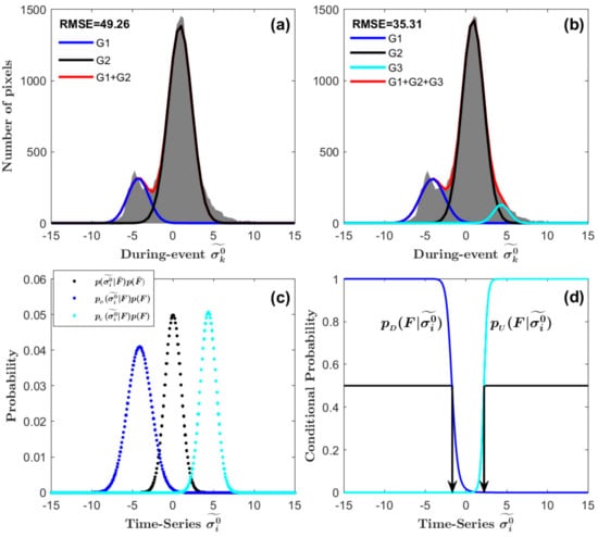 - With the normalized time series, for each pixel, construct the conditional probability of an epoch to be flooded, using the following equation:and are the prior probabilities for the flooded and nonflooded epochs. Here we assumed the direction of intensity change on the same pixel, should it be flooded, remained unchanged throughout the short time series. With this assumption, we can adopt the noninformative priors of for simplicity [29], on both cases of flooded with intensity decrease and intensity increase. For the likelihood functions and , we assumed Gaussian distributions for both, and the equations are as follows:and are the mean and standard deviation for the nonflooded epochs in the normalized backscattering () time series; therefore, their values are 0 and 1, respectively. The other set of statistical descriptors, and , are for the flooded epochs. Since we only had 1 flooded epoch in the whole time series, we proposed to use the statistics from the spatial domain, which we can estimate from histogram fitting of the normalized during-event backscattering () using the Levenberg–Marquardt algorithm [30] as suggested in [29,31]. We first chose a region that covered central Lumberton, where intensity decreases and increases due to flood should both existed and their components were more likely to be statistically meaningful (Figure 3d). Then, instead of two Gaussians, we fit the histogram with the sum of three Gaussian curves:The third Gaussian curve fits the bulging part at the high end of the histogram and, hence, gives lower root-mean-square errors compared with the two-Gaussian model (Figure 5a,b). We used the parameters for the Gaussian curves on the left and on the right (Figure 5a), (m1, s1) and (m3, s3), to approximate the and in the likelihood functions for the pixels of intensity decrease () and intensity increase () respectively (Figure 5c). From here we can construct the conditional probability function for each case separately (denoted as and in Figure 5d using (4).