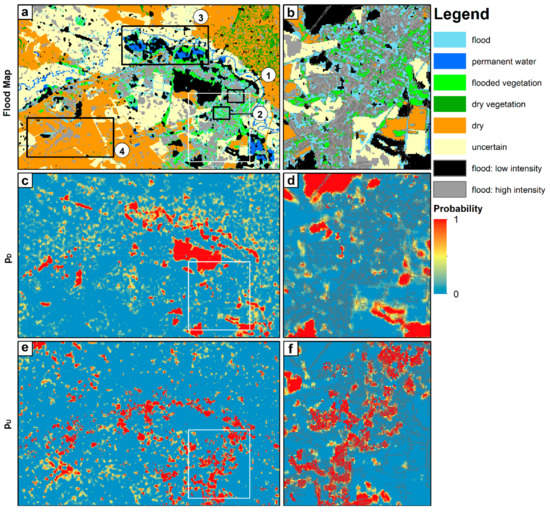 Flood mapped by the probability threshold of p = 0.5 for (a) the whole area of interest (AOI) and (b) the urban area. The second and third panels are for the probability maps of (c–d) intensity decrease () and (e–f) intensity increase (). Numbers in white circles are the patch IDs used in discussion.