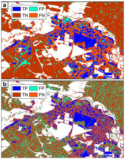 Next, we looked at the probability maps (Figure 6c–f). The transition zone of intermediate probability (yellow color) was narrow, with the majority of the mapped flood at the high probability end (p > 0.9; red color). The effect of underprediction was also demonstrated by having low probability values in the pixels within the Flood and Flooded Vegetation classes (Figure 6b vs. Figure 6d,f). Their spatial distributions were more clearly shown by the contingency map (Figure 7), where the mapped urban flood was mainly surrounded by FN pixels. Overprediction (FP pixels), on the other hand, was not as common within the urban area.