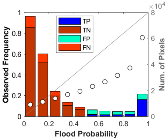 The reliability diagram between the flood probability and the observed frequency (white circles). The number of pixels for each probability bin is shown in vertical bars color-coded by contingency types. The deviation of the circles from the 1:1 line represents the error for each probability bin. The pixel counts in different contingency types shows that the error comes from FN (underprediction) for probability bins below 0.5, and FP (overprediction) for probability bins above 0.5.