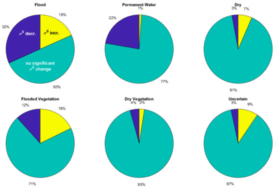 Pie charts showing, for each of the 6 classes, the proportions of pixels detected as flooded with either σ0 decrease (blue) or σ0 increase (yellow), or as nonflooded with insignificant σ0 change at the p50 thresholds.