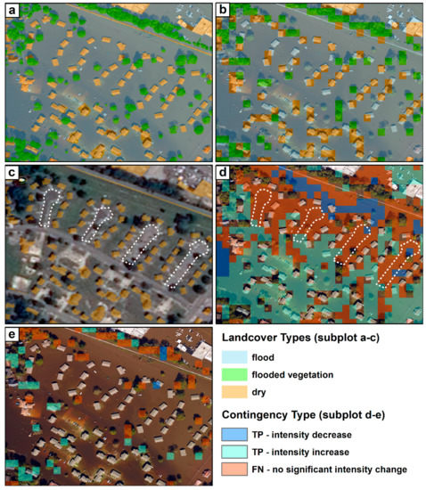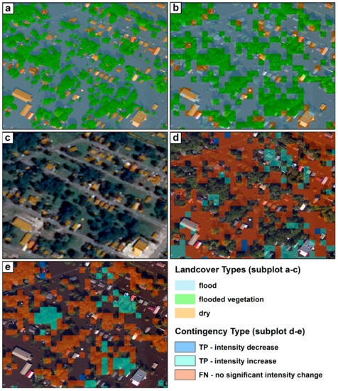 The during-event aerial photo for patch 1 (see Figure 6a for location), overlaid with (a) the land cover classes in vector format, and (b) the rasterized land cover map in 15 × 15m resolution. (c) The pre-event satellite image overlaid with the Dry class for reference. The white dashed lines represent asphalt driveways. (d) The contingency map for the Flood class. (e) The contingency map for the Flooded Vegetation class.
