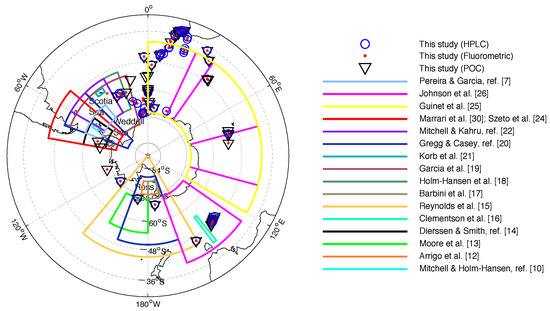 For each satellite data extraction, an iterative process was applied within the 12 h time window until a valid matchup was found. The matchup locations can be seen in Figure 2, with the matchup locations of other SO studies included for comparison. Note however that the study areas of Sullivan et al. [11], Kahru & Mitchell, ref. [23] (NOMAD and Scripps database south of 55S latitude) and Haëntjens et al. [29] do not appear since data from these studies were distributed all around Antarctica. In addition, note that despite the apparent large distribution of data used in Johnson et al. [26] more than 95% was collected from between 140.8E and 150.8E. Finally, please note that an analysis of the uncertainty associated with the satellite-derived Rrs (see various sources in [38]) used to derive chlorophyll-a and POC is considered outside the scope of this study.