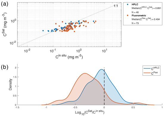 (a) Comparison between measured (C) and retrieved (C) chlorophyll-a for box 1 with a time window of 12 h. Blue and orange dots indicate samples measured from HPLC (C) and fluorometry (C) respectively, while the dashed line shows the 1:1 relationship. (b) Probability density function of the logarithm base 10 of the ratio between C and C from fluorometry (blue line) and HPLC (orange line); with the statistics of the comparisons listed in Table 2.