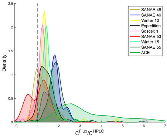 Probability density function of the ratio between chlorophyll-a measured from fluorometry (C) and HPLC (C). Each color corresponds to a specific expedition.