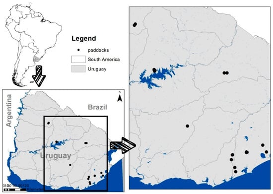 South America map highlighting Uruguay (up-left corner) and paddock´ location in Uruguay (bottom left corner and right).