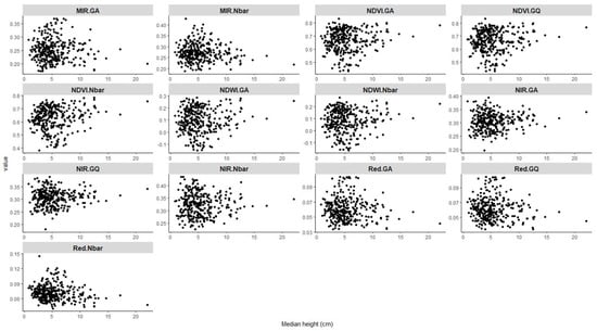 Scatterplot of median height (cm) in the x axes and MODIS satellite information in the y axes for all the analyzed paddocks. MIR: Middle infrared band, NIR: Near infrared band, Red: Red band, NDVI: Normalized difference vegetation index, EVI: Enhanced vegetation index. Nbar (MODIS/Terra and Aqua Nadir BRDF (bidirectional reflectance distribution function) adjusted reflectance (NBAR), 500 m), GA (MODIS Terra/Aqua Surface Reflectance 500 m), and GQ (MODIS Terra/Aqua Surface Reflectance 250 m) refer to the MODIS daily products analyzed.