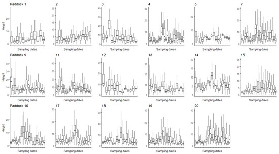 Height (cm) boxplot showing the distribution of observed data of each one of the 17 individually analyzed paddocks. Paddocks with less than 10 sample dates were discarded (paddock 6, 8, and 10). Sampling dates, from October 2012 to December 2015, are different according to each paddock.