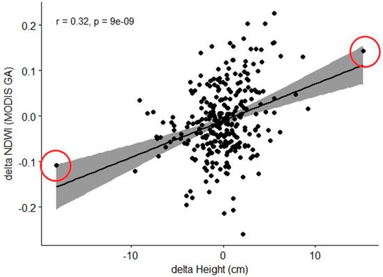 Linear correlation between delta median height and delta NDWI from MODIS GA product, considering the whole field information together. Pearson correlation value and significance are r = 0.32, p < 0.001. The tow influential data points are circled in red.