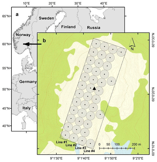 (a) Location of the study area and (b) design of the trial. The black dots are the point-centered quarter sampling points, which were centers of the 25 m radius plots (gray circles) arranged along four sample lines; green is defined as forest according to the official N50 topographic map series; light yellow is above the tree line; the black triangle is the reference point (base station).